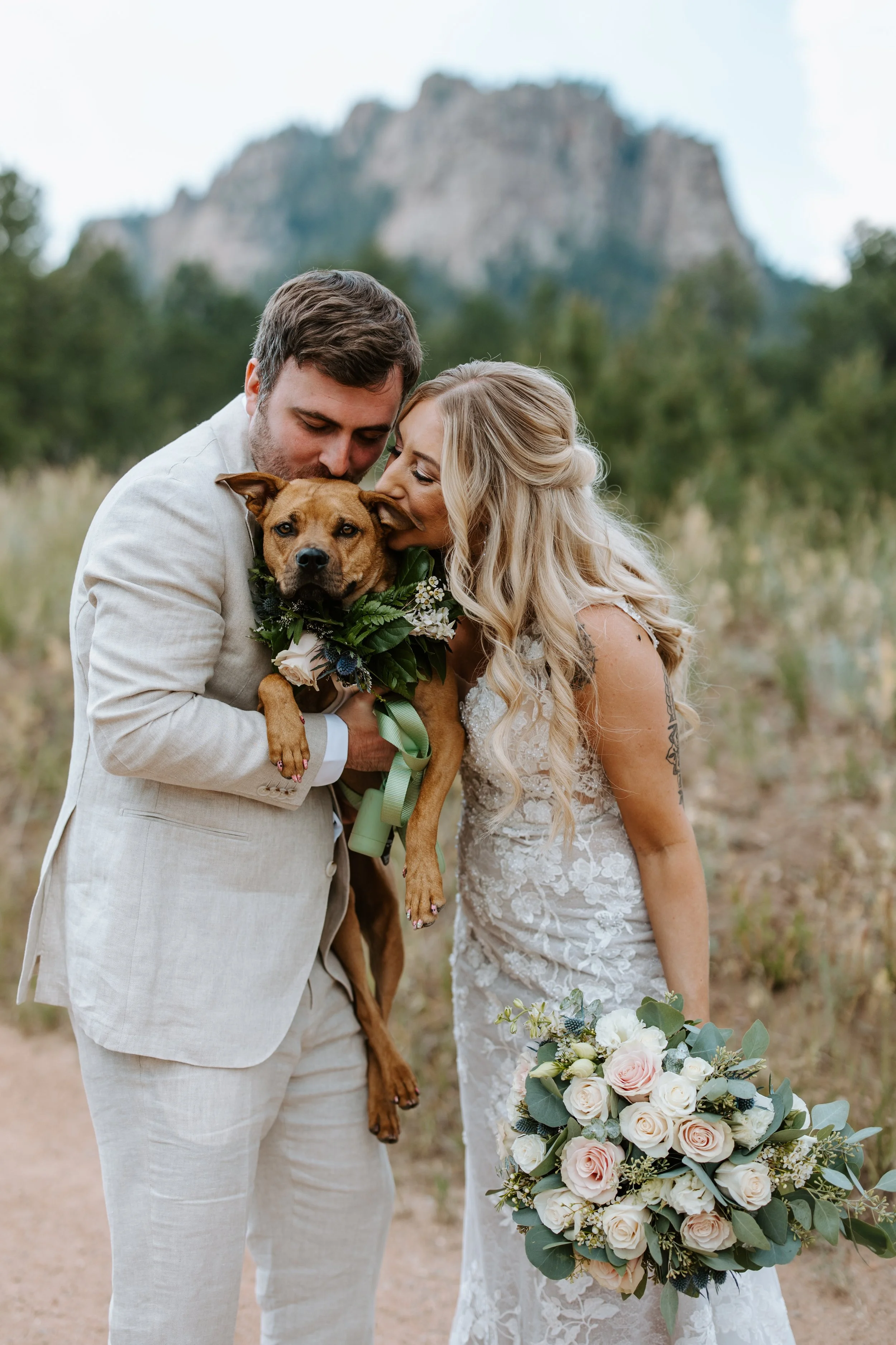 On the wedding day Willow was very comfortable with Lauren, and having Pets of Honor there was a huge stress that was lifted off our shoulders. Lauren drove to our cabins in Evergreen to pick up Willow and chauffeured her to our venue in Pine, CO (about a 30-minute drive). She provided Willow with toys, treats, and even left a personalized treat at the cabins for us. She kept Willow calm throughout the few hours that we had her at the venue, and we got the most precious photos with Willow thanks to Pets of Honor. Lauren even took some photos of Willow watching over the ceremony as we got married and it literally melted my heart. After the ceremony, Willow was chauffeured back to the cabins where Lauren fed her, walked her, and made sure she was all set until we got back after the reception. Lauren communicated very well throughout the entire day by sending texts to my mom to keep us in the loop. We were very thrilled with the entire process and so happy with how the day turned out.